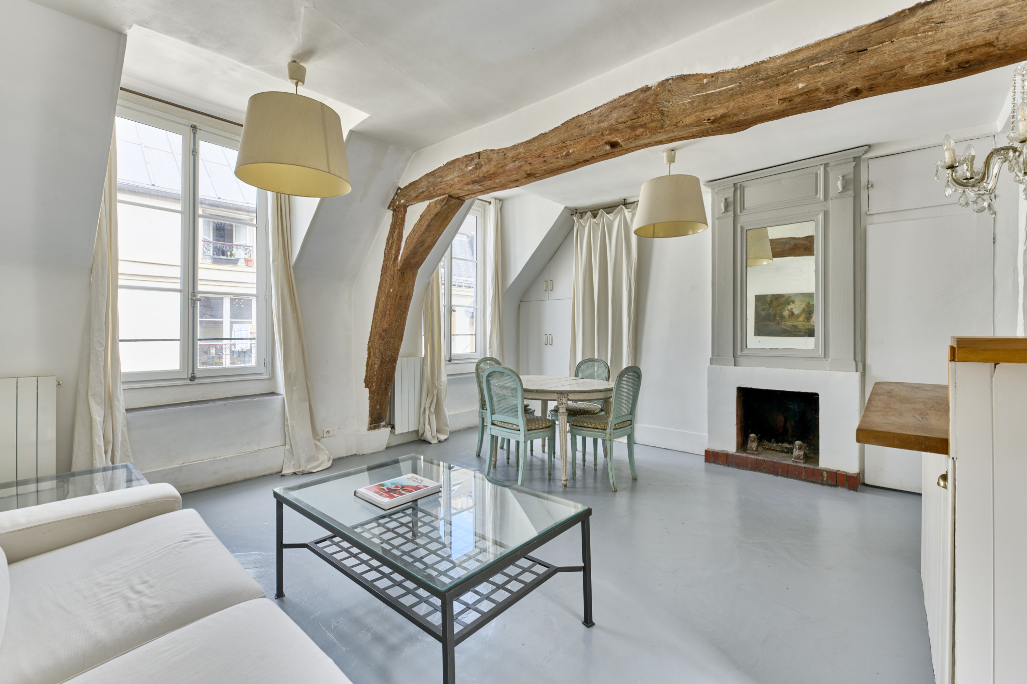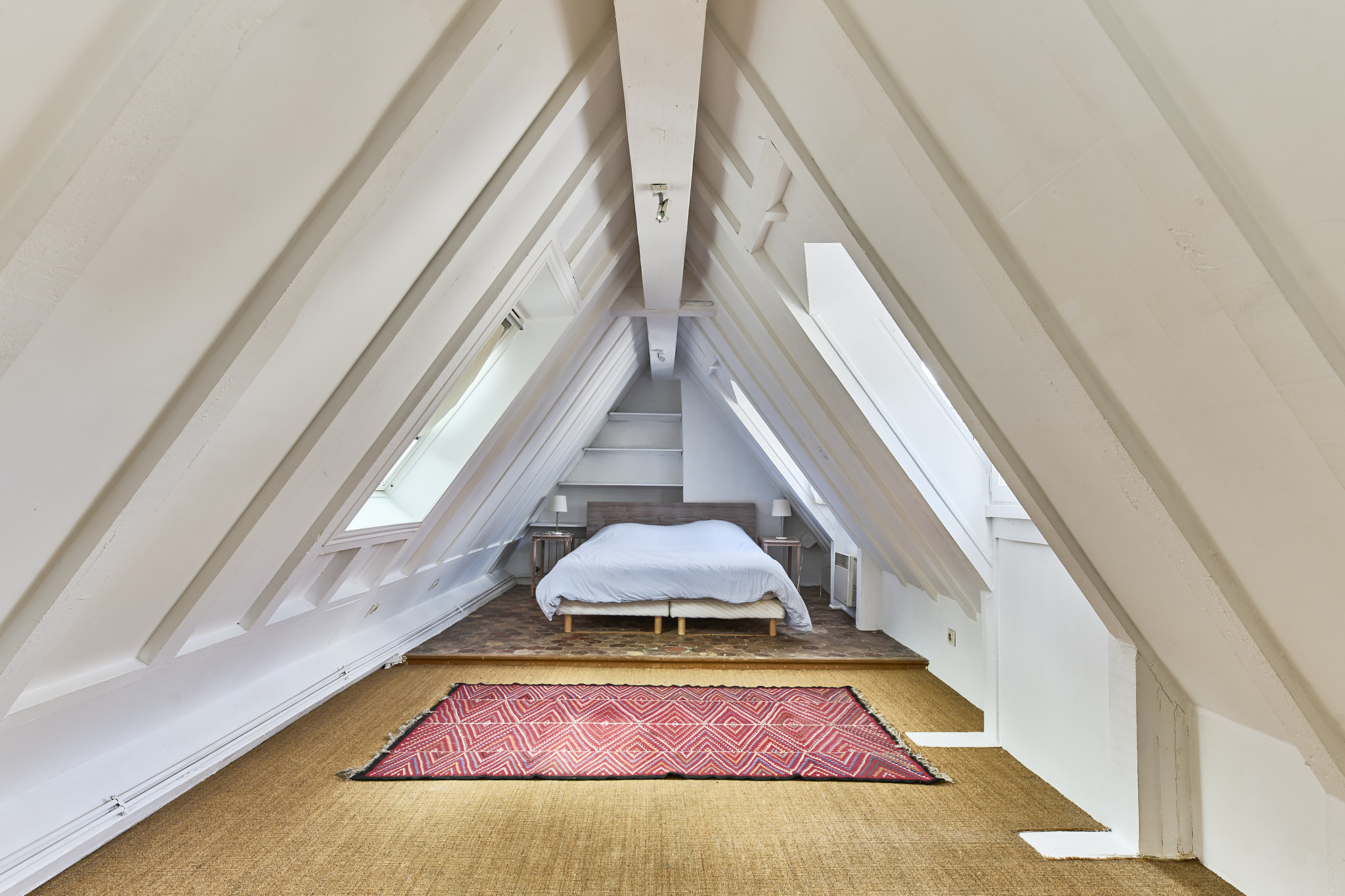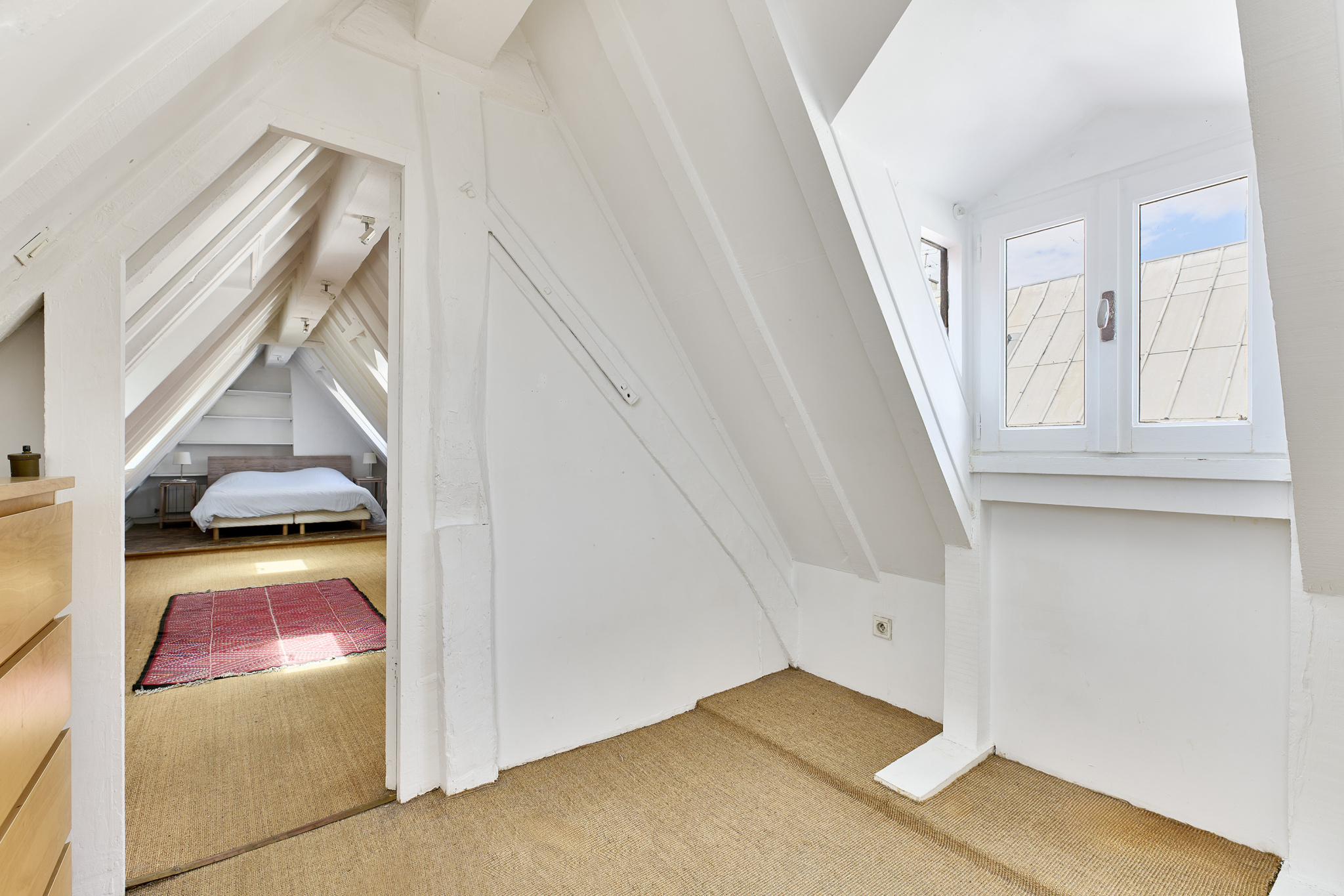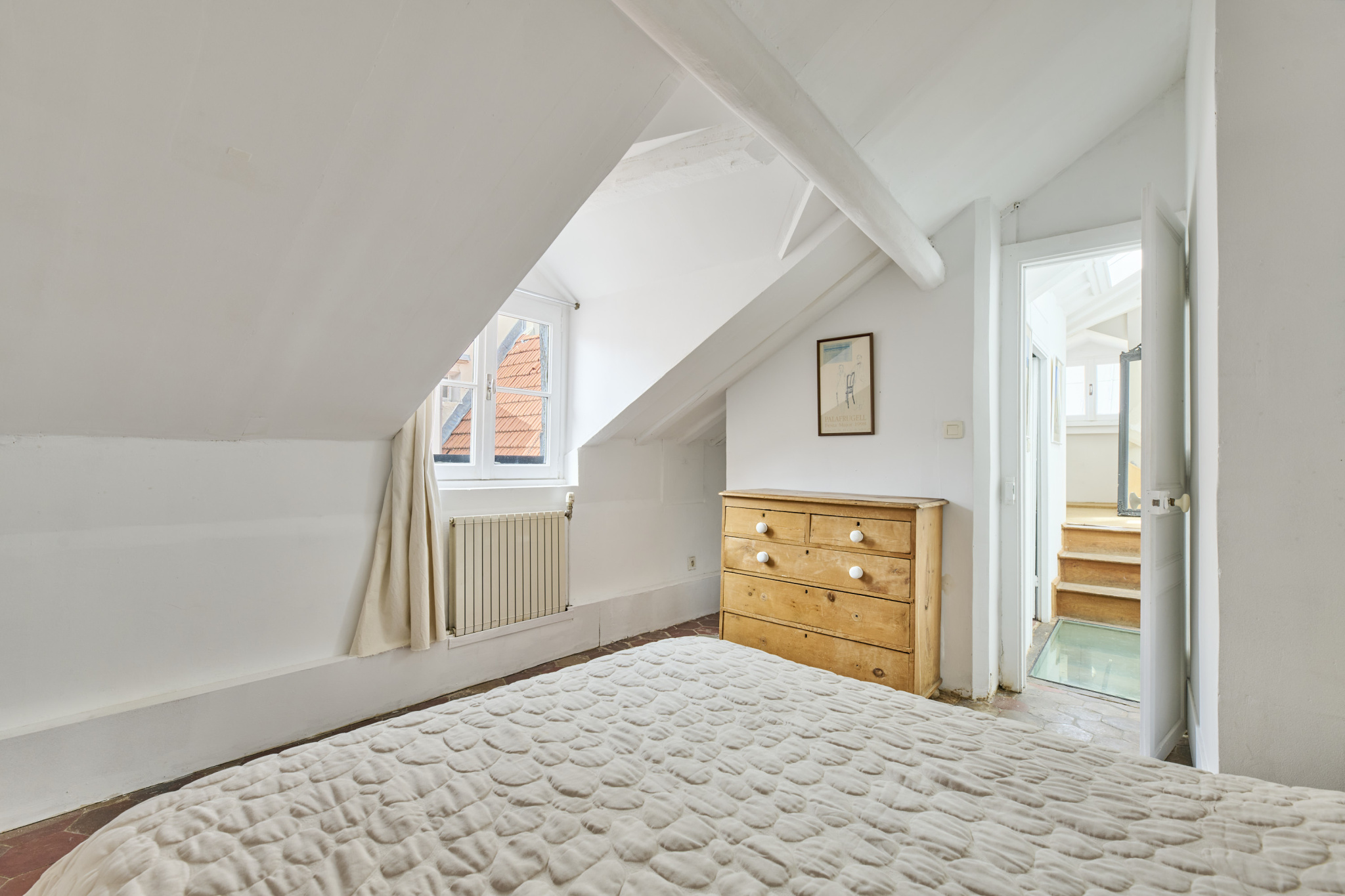 Grâce à sa triple exposition, ce bien sous les toits bénéficie d'une luminosité constante et d'un calme absolu, tout en étant au centre d'un quartier historique animé.