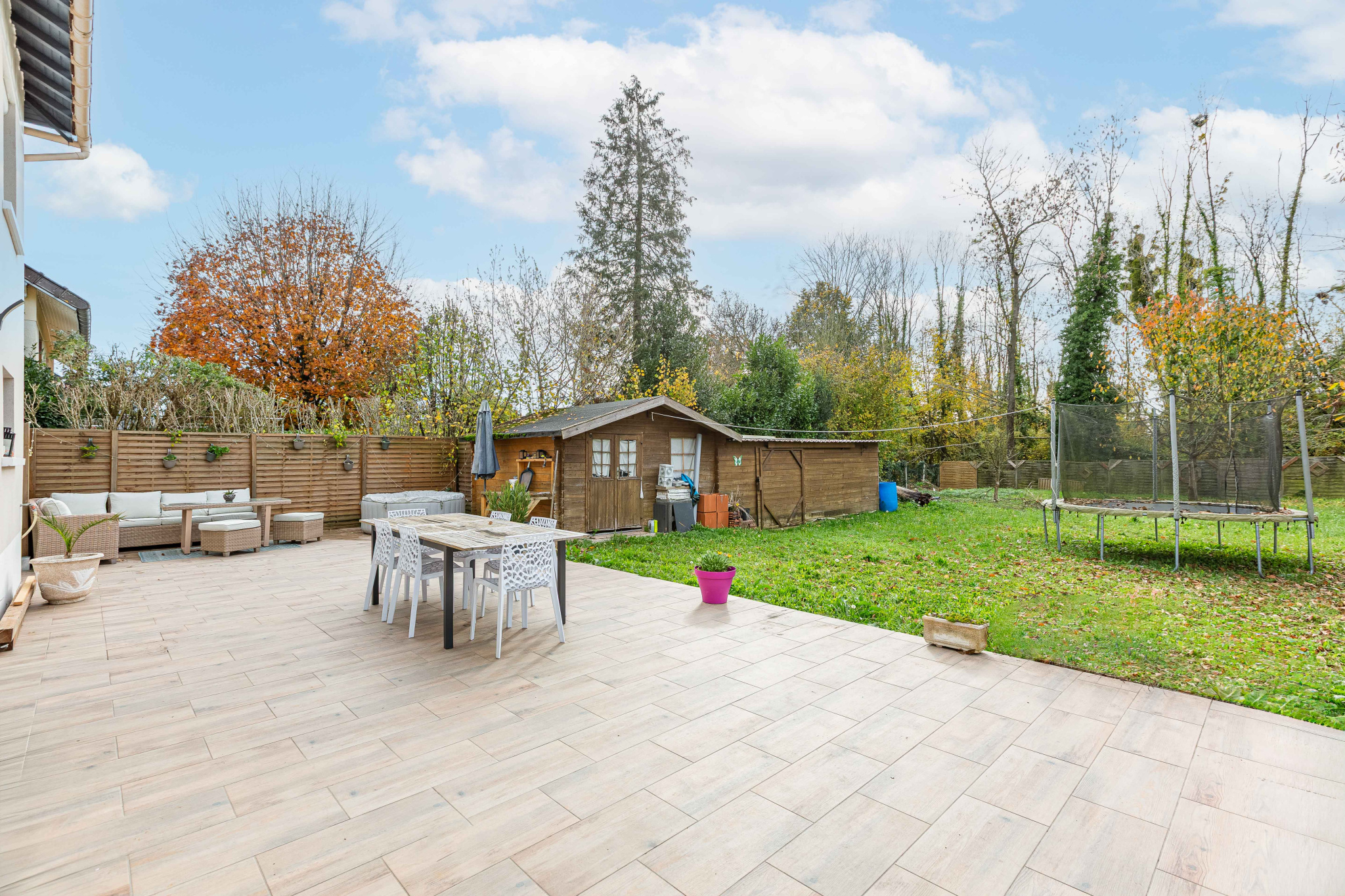 La maison bénéficie d'un grand jardin arboré avec deux vastes cabanons, ainsi que d'une terrasse de 64 m2 aménagée avec un grand salon de jardin et un Jacuzzi. Ce cadre paisible est sans aucun vis-à-vis.