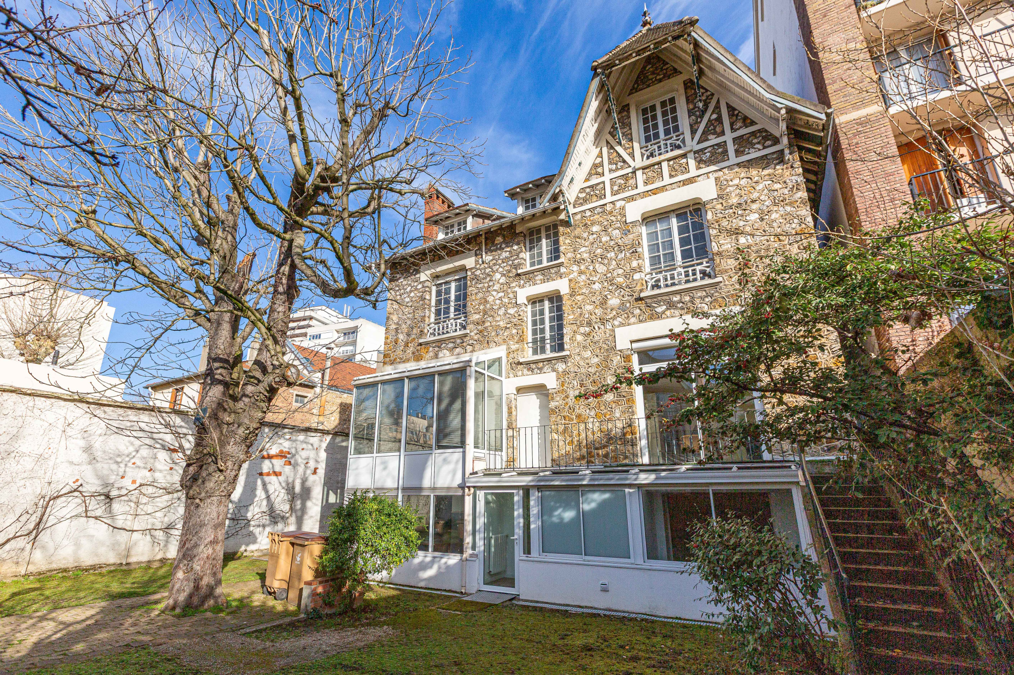 À l'extérieur, 400 m2 de terrain prolongent la maison avec un jardin et un espace de stationnement -- un luxe dans ce quartier vivant de Colombes.