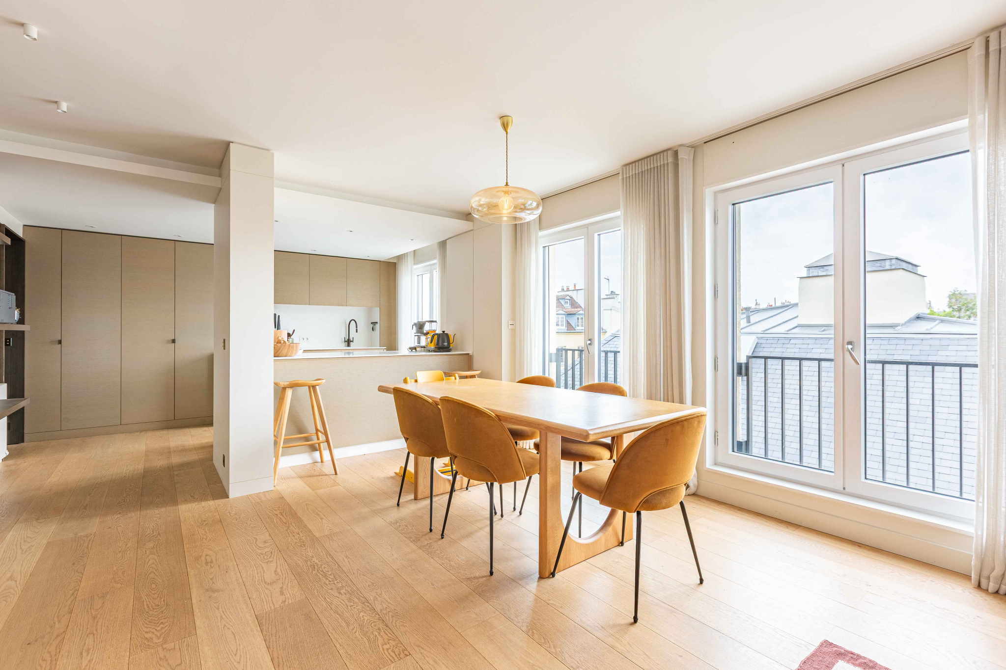 À l'abri des regards, au calme absolu, au 5e étage avec ascenseur, cet appartement offre une lumière continue et une vue dégagée.