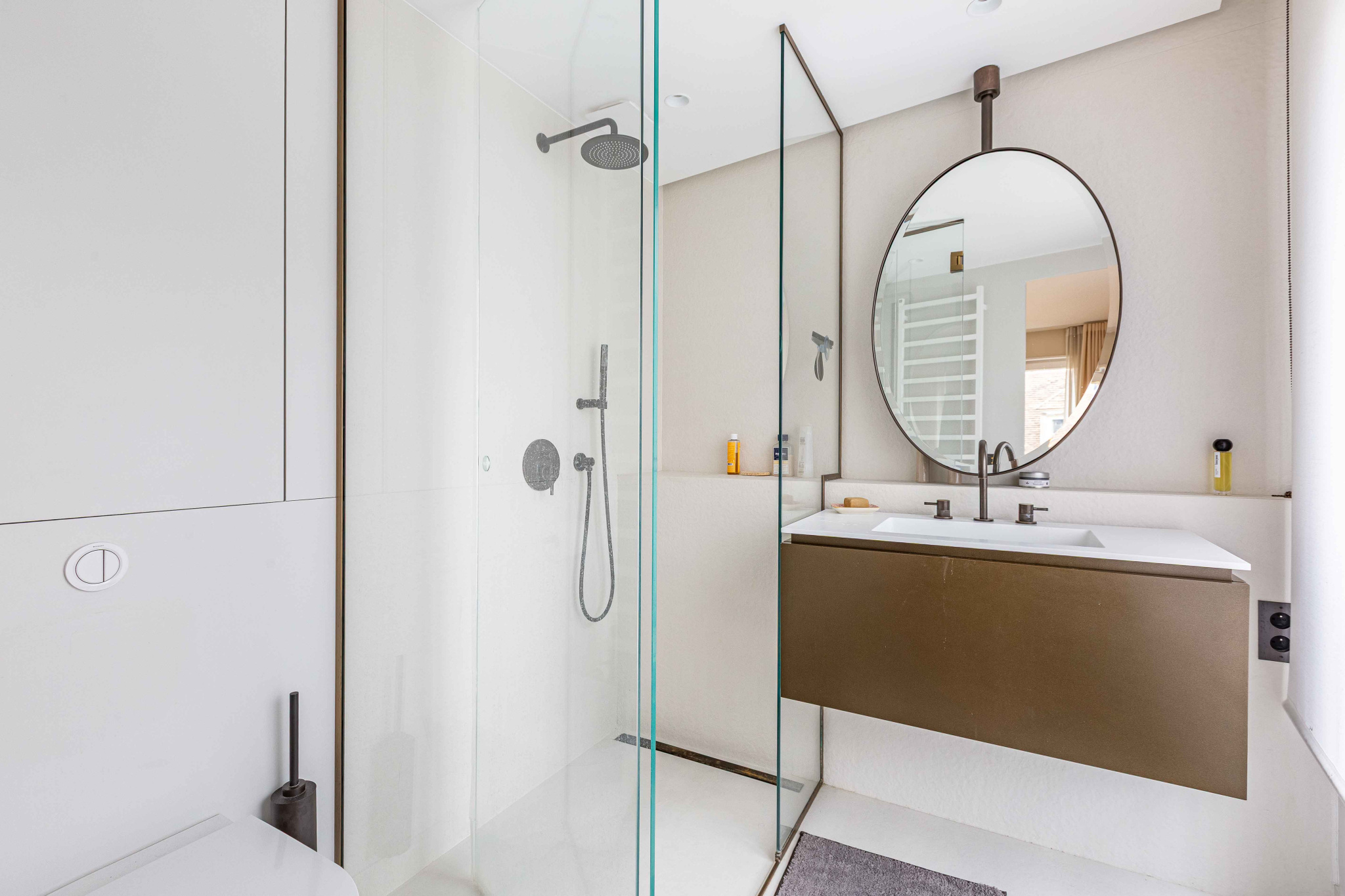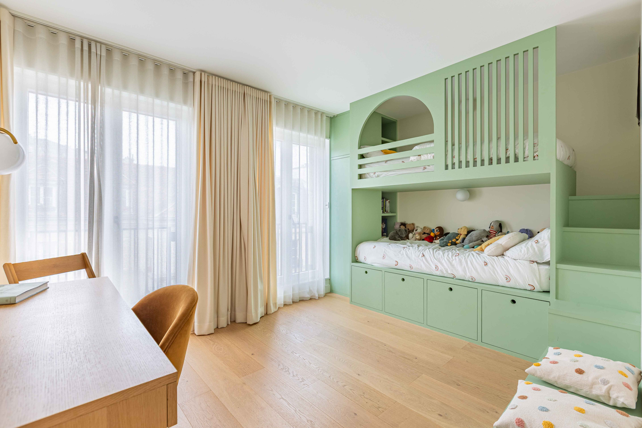 À l'abri des regards, au calme absolu, au 5e étage avec ascenseur, cet appartement offre une lumière continue et une vue dégagée.