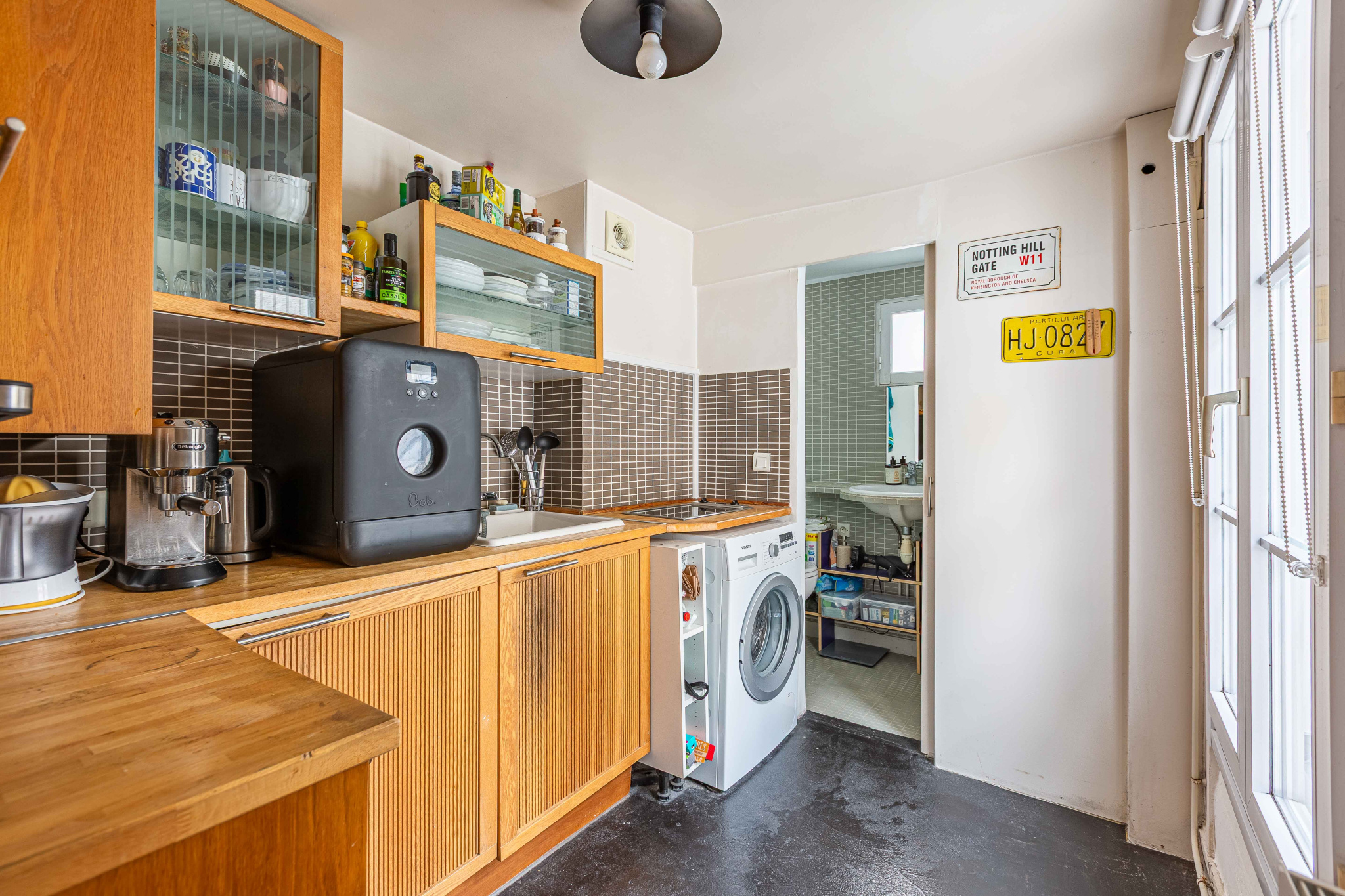 Cuisine aménagée aux lignes simples, salle d'eau avec WC, rangements intégrés. Parquet et moulures rappellent le charme discret de l'ancien, sans ostentation.