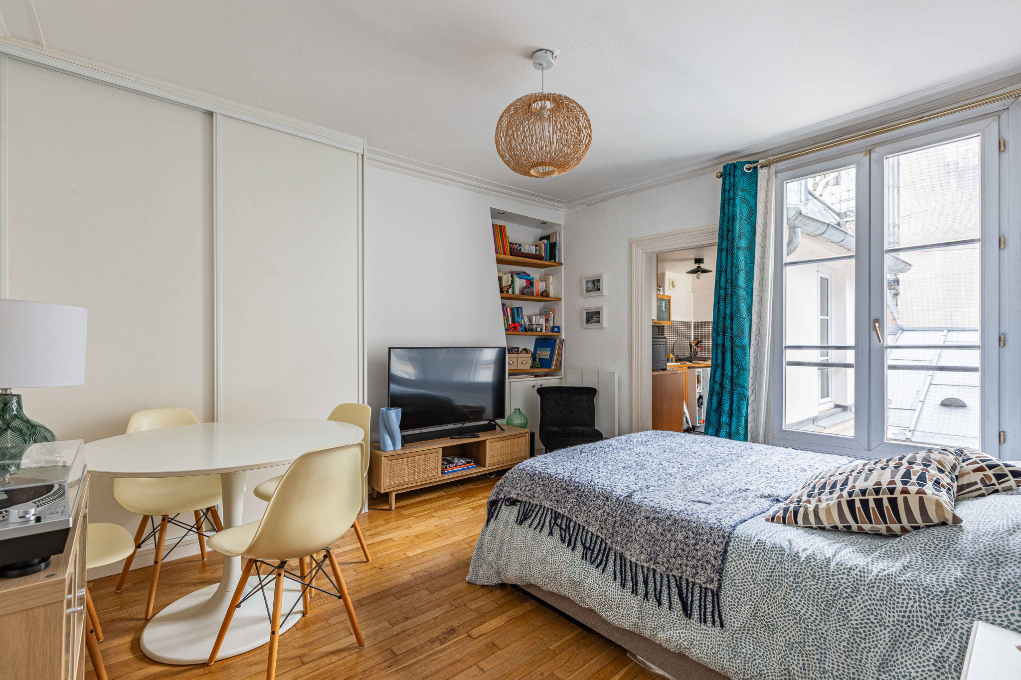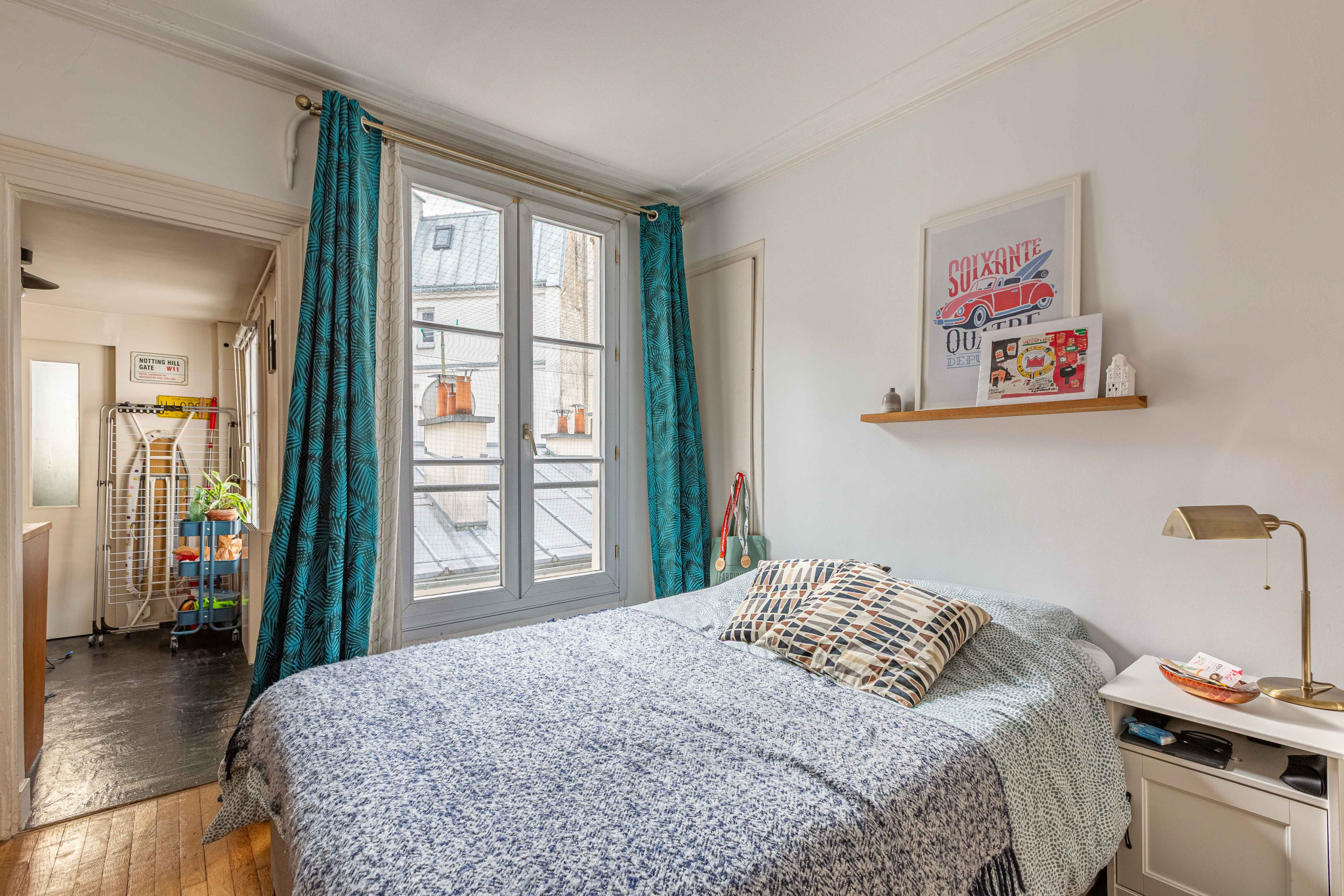 Ouvert sur cour, l'appartement bénéficie d'une belle clarté et d'une vue dégagée sur le ciel, rare dans le quartier. Une atmosphère paisible, presque suspendue.