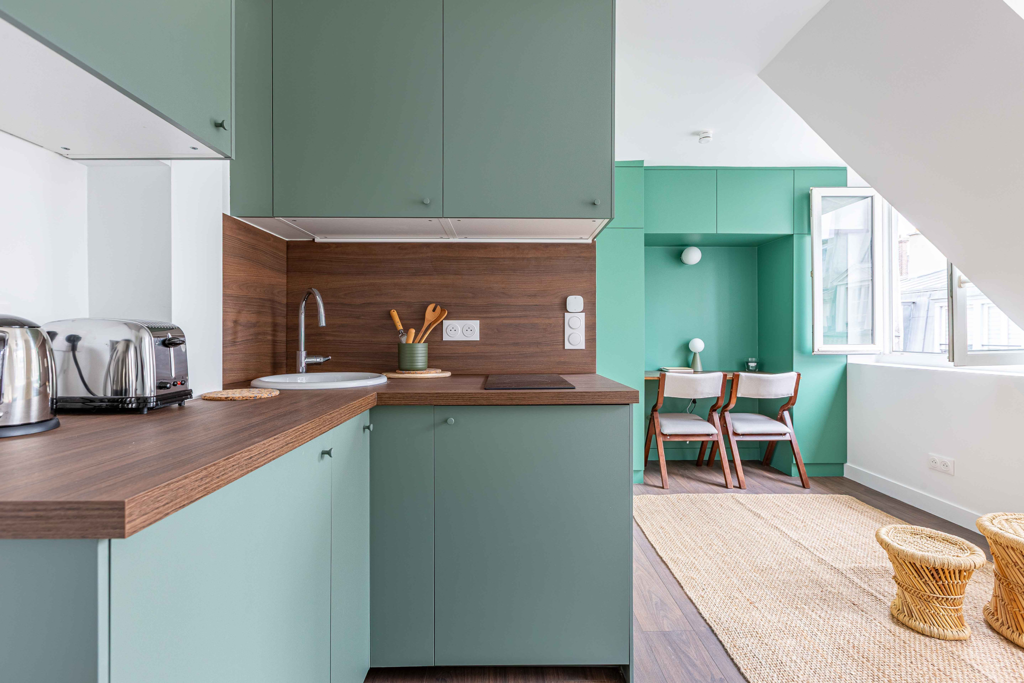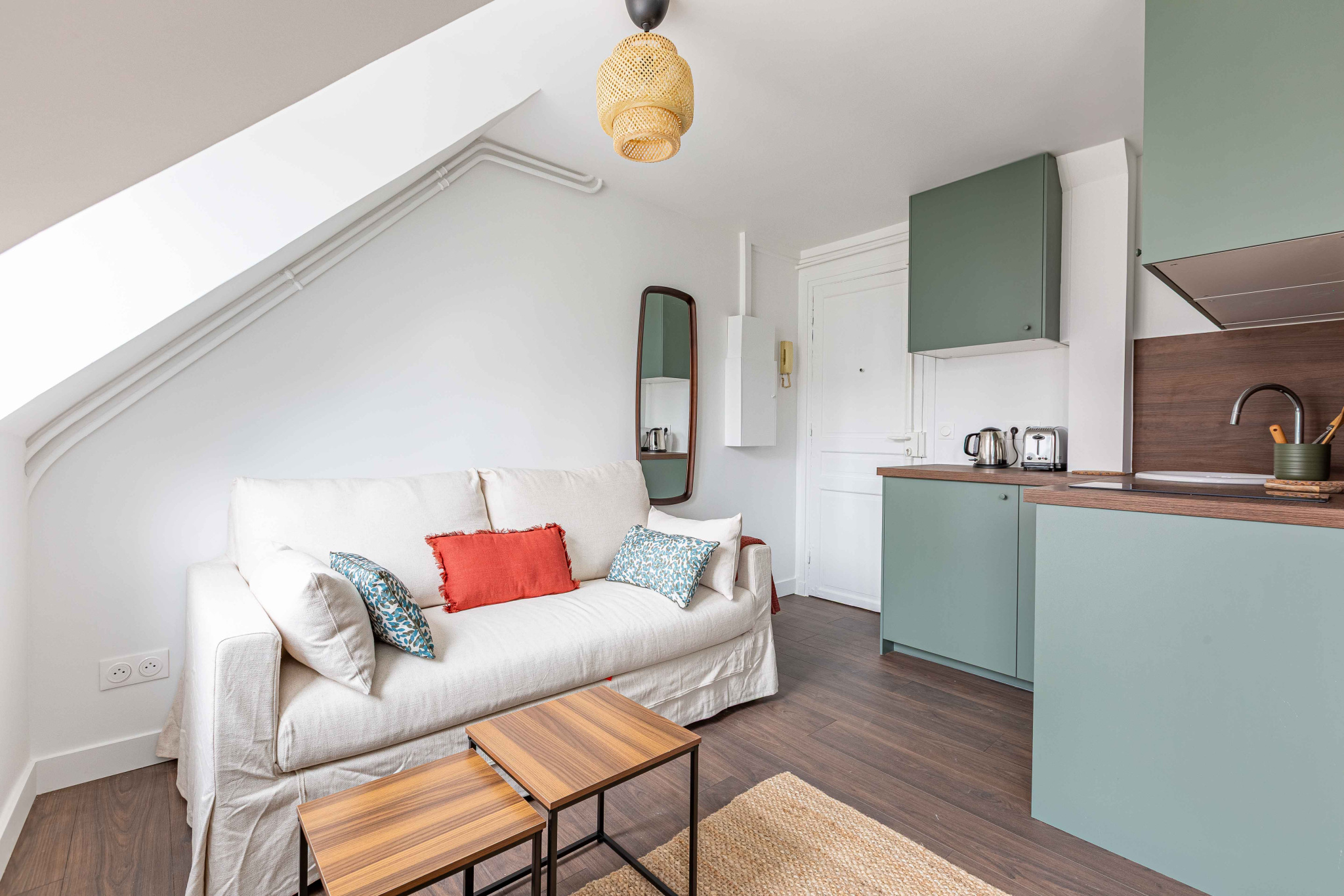Rue des Saints-Pères À deux pas de Saint-Germain-des-Prés et de la Seine, studio rénové par architecte au 5e étage avec ascenseur. Exposé ouest, vue dégagée. Cuisine ouverte équipée avec lave-linge. Salle d'eau avec grande douche et WC. Coin bureau, nombreux rangements, canapé-lit : un aménagement astucieux pour un espace optimisé. Bien calme et rare dans l'un des plus beaux quartiers de Paris. BAIL CODE CIVIL
